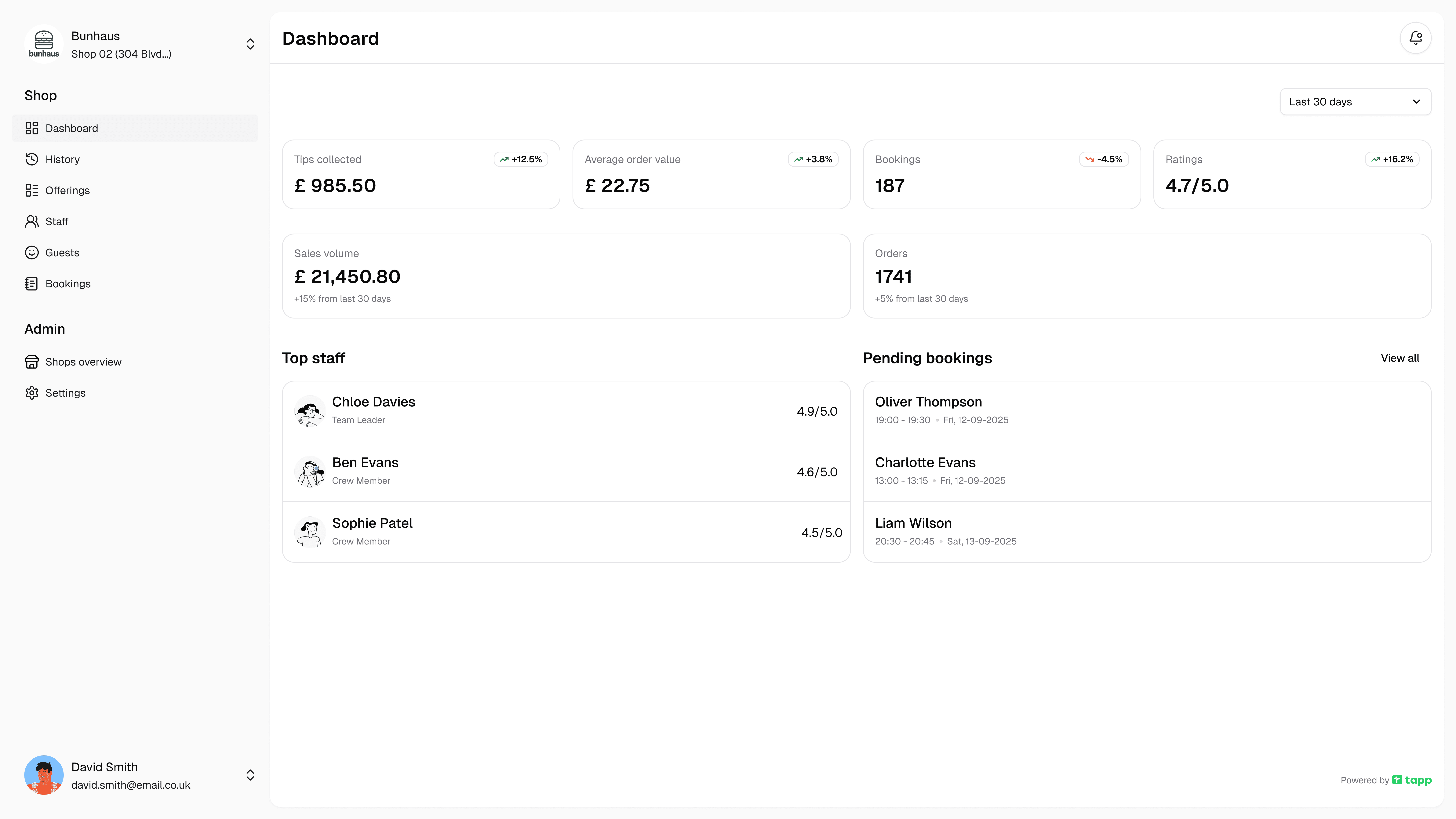 Monitor rush-hour trends, top items and staff performance. Adjust menus and staffing instantly using Tapp’s live analytics.
